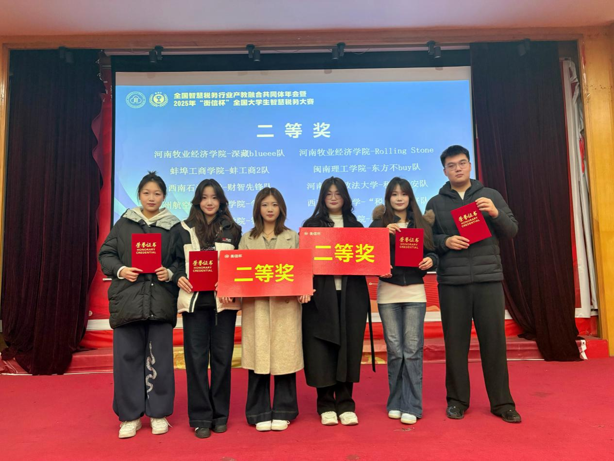 11月29日,2025年全国智慧税务行业产教融合共同体年会暨“衡信杯”全国大学生智慧税务大赛(第十一届)总决赛在江西财经大学举行。经过与全国包括江西财经大学、西南财经大学等知名高校在内的88所本科高校、98支队伍的激烈角逐,河南牧业经济学院金融与会计学院派出的两支参赛团队凭借扎实的理论知识、娴熟的实操技能和稳定的临场发挥,全部荣获全国本科组二等奖的优异成绩,充分展现了我院学子的卓越风采和财税人才培养的扎实成果。
