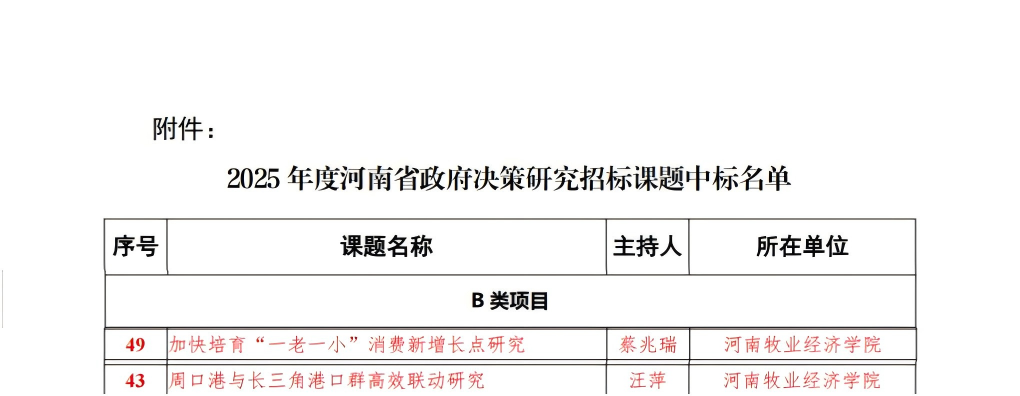 近日,2025年度河南省政府决策研究招标课题立项名单公示,我院汪萍博士申报的《周口港与长三角港口群高效联动研究》、蔡兆瑞博士申报的《加快培育“一老一小”消费新增长点研究》课题获批立项。