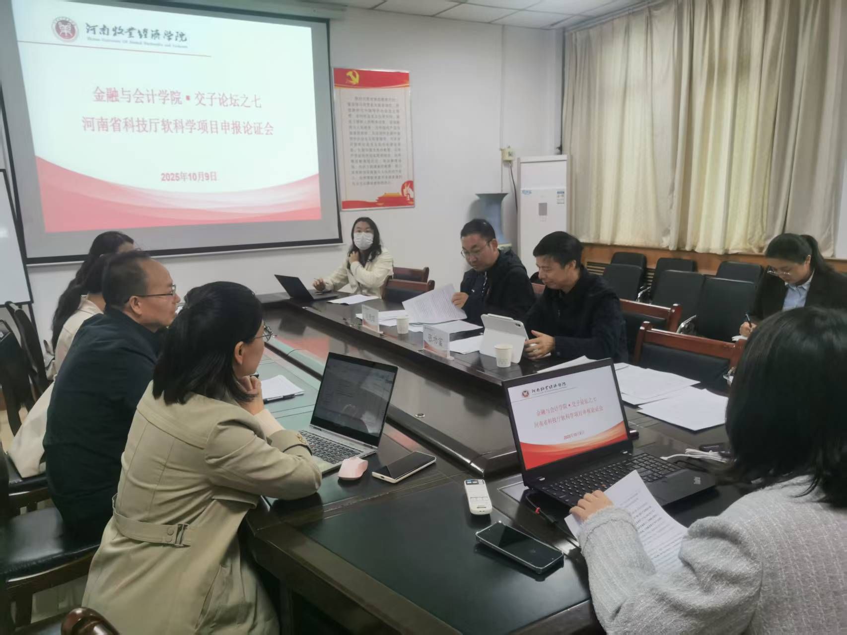 为扎实推进我院2026年度河南省科技厅软科学项目申报工作,全力提升申报质量,我院于2025年10月9日下午,在教学楼514会议室召开2026年度河南省科技厅软科学项目申报论证会。本次论证会邀请郑州航空工业管理学院张功富教授和河南财经政法大学赵德昭教授作为评审专家。金融与会计学院院长贾宪军教授、项目负责人及部分教师参加了论证会。会议由副院长崔海红教授主持。
