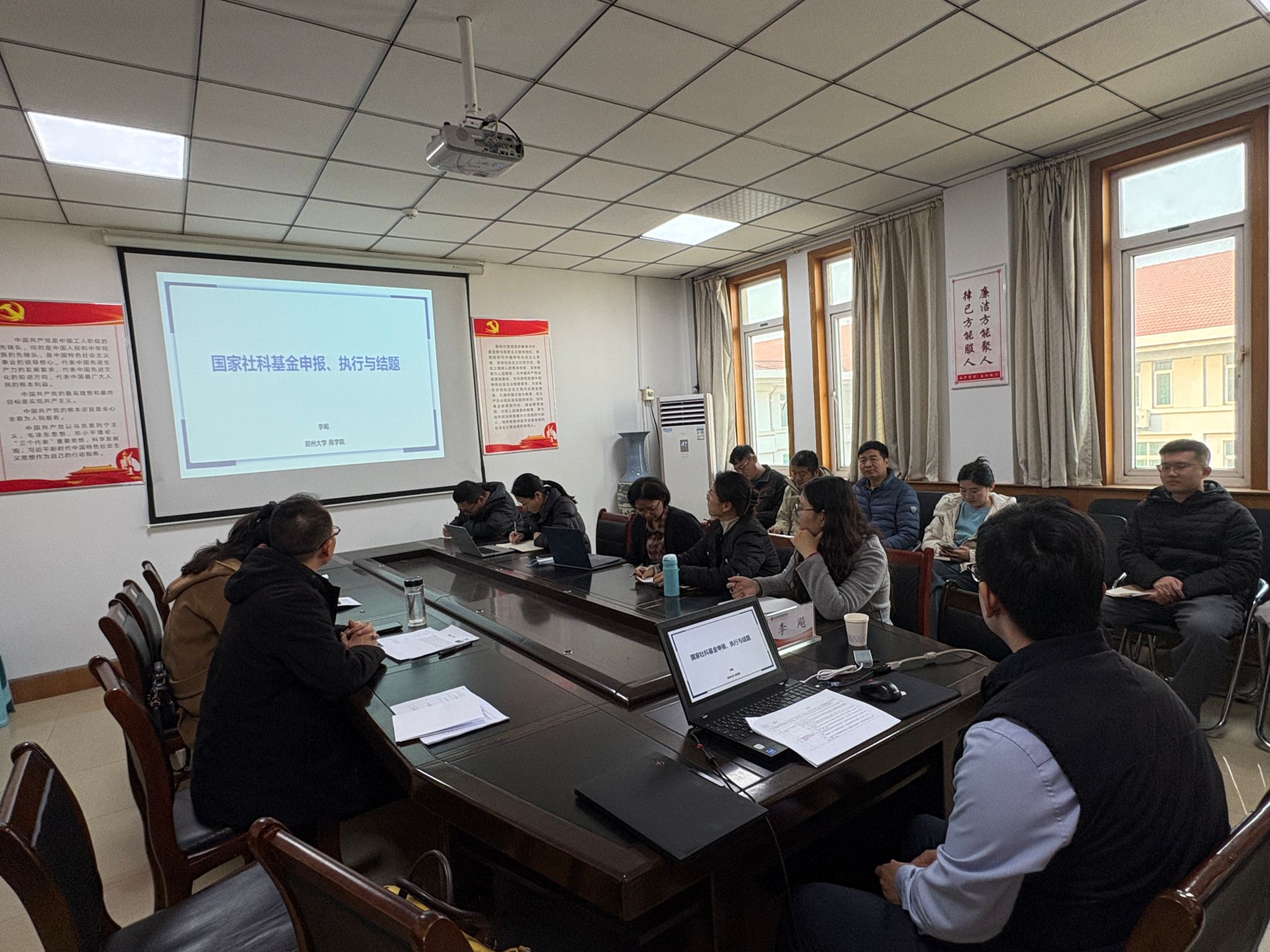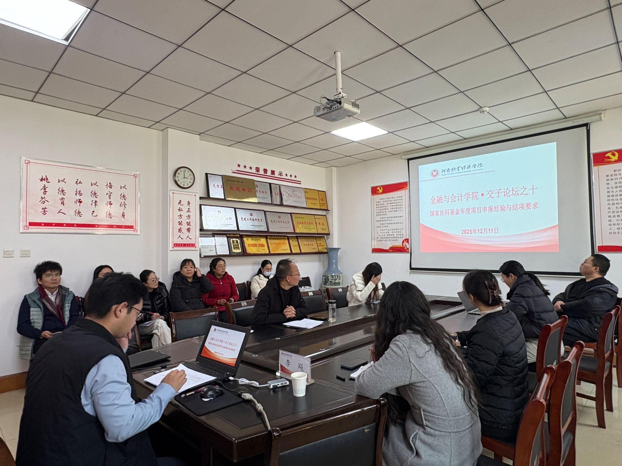 2025年12月11日下午,金融与会计学院在教学楼514会议室举办国家社科基金申报专题指导讲座,特邀郑州大学商学院李飚教授担任主讲,围绕“国家社科基金申报、执行与结题”开展系统讲解,并对学院教师的申报课题进行现场点评与指导。学院博士、部分教师及兄弟学院教师参加了此次讲座,讲座由金融与会计学院院长贾宪军教授主持。