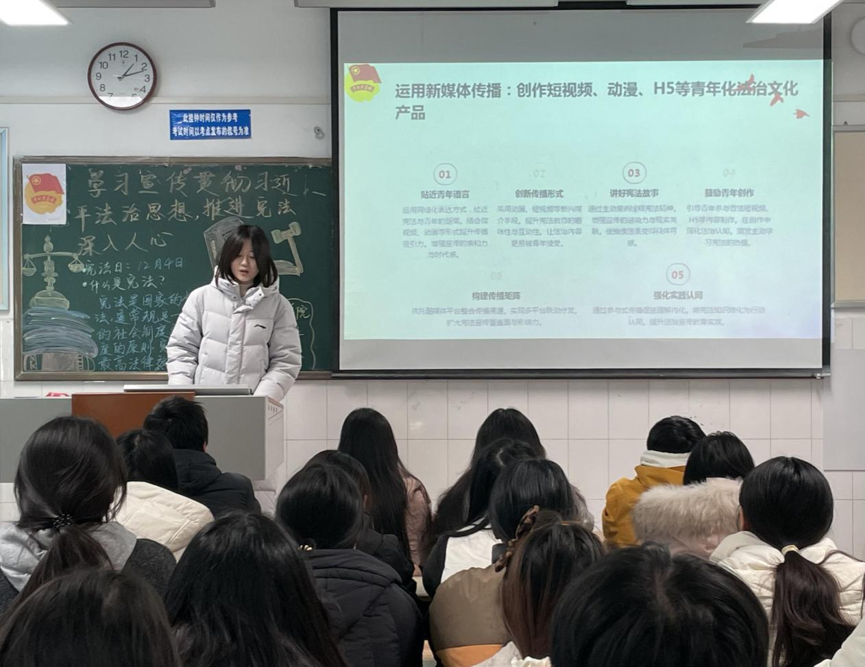 在嘹亮的团歌声中,各班团课活动有序展开。活动伊始,各班团支书系统介绍了我国宪法的起源、基本原则等相关内容,并结合实际案例阐述如何切实推动宪法实施,深化了同学们对宪法的理解与运用。随后,团支书带领同学们系统研读习近平法治思想的核心要义和实践要求,深入领会习近平文化思想中“法治文化是法治国家的精神支撑”这一内涵,深刻理解“依宪治国、依宪执政”的重大意义,进一步明确了新时代青年在弘扬宪法精神、维护宪法权威、推动宪法实施中的责任使命与行动方向。在最后的“宪法知识我知道”和“宪法实施我参与”讨论环节中,同学们围绕宪法基本原则、国家机构职能、公民权利义务等核心知识点踊跃发言,现场气氛热烈,充分展现了青年学子的责任与担当。