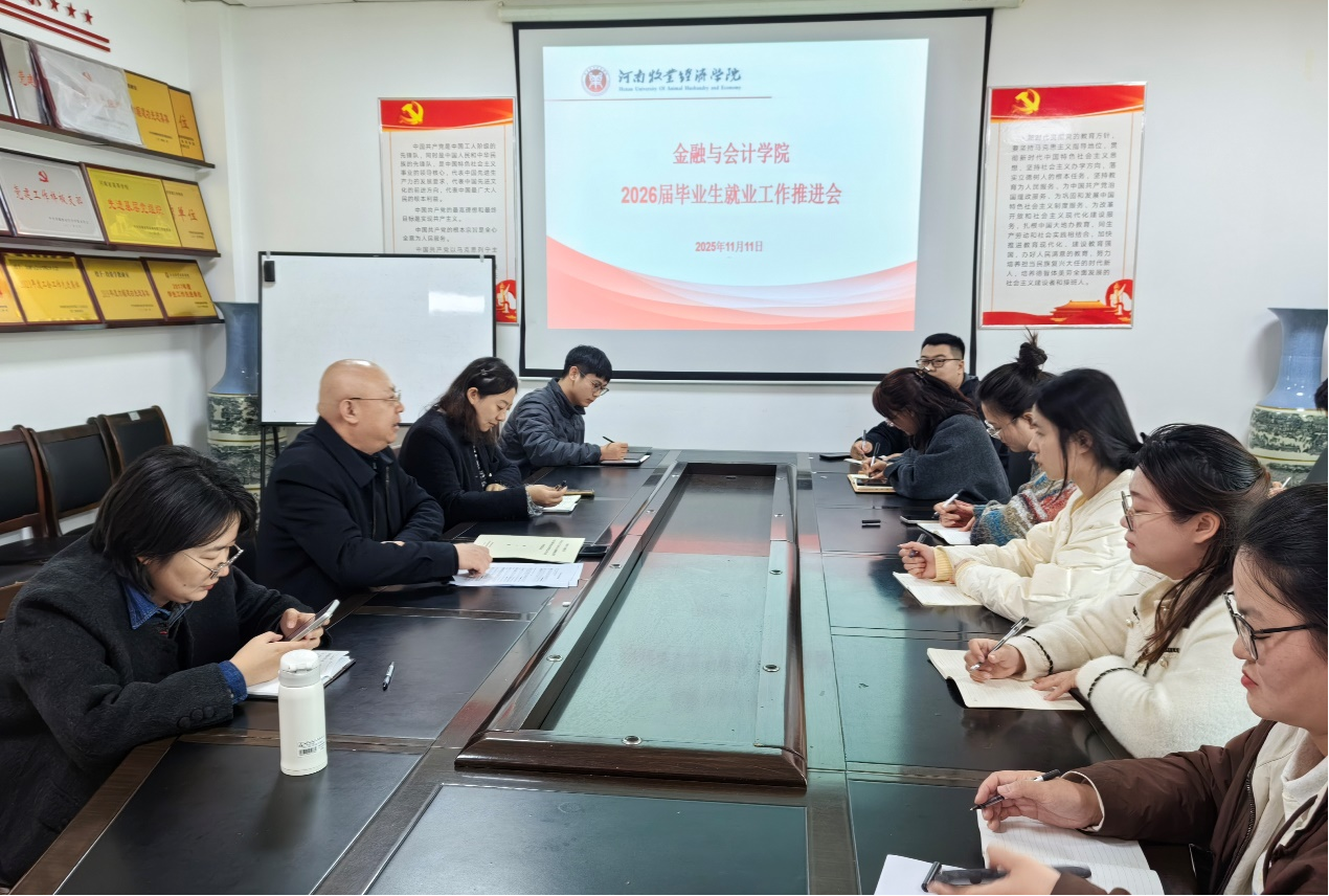 金融与会计学院于2025年11月11日在教学办公楼514召开了毕业生就业工作推进会,院党委书记陈复昌、团委书记葛婉、团委副书记刘慧莹及全体辅导员参加会议。